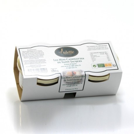 | Conseils d'utilisation | Découpez un rond de pâte feuilletée d’un diamètre légèrement supérieur au rebord de la verrine. Mouillez légèrement les bords de la pâte feuilletée et déposez-la sur le bord du bocal en faisant bien adhérer les bords. Dorez votre pâte feuilletée au jaune d’œuf à l’aide d’un pinceau. Placez votre cassolette de Saint-Jacques au four préchauffé thermostat 7 pendant 15 minutes environ. Servez aussitôt. |
