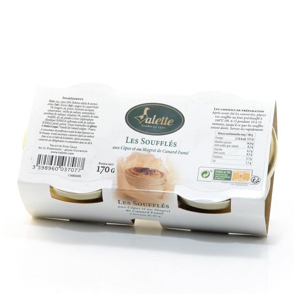 Une belle mise en bouche mêlant la délicatesse du soufflé avec nos délicieux produits du terroir que sont les cèpes et le magret de canard fumé qui viennent titiller les papilles, une entrée raffinée à déguster entre amis. Vous avez seulement à les réchauffer!
